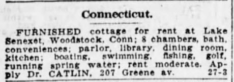 The "Lakeside Vacation Home" on "Quasset Brook Farm" Roseland Park Road still stands. It was a summer resort - see flyer. (in the area that is now Cornfield Point condos) In 1909, it rented for $2.50/day (or $8-15/week), accommodating 30 to 40 guests "on a farm with fields, extending down to the shore of Lake Senexet...surrounded with pleasant lawns, well shaded by fine old trees. It is supplied by excellent water piped from a spring on the hillside....next to Roseland Park and Woodstock Country Club (also called the Woodstock Golf Club). Complete with a romping room! Activities listed as: tennis, badminton, quoits, croquet courts on lawns, golf (minimum fee), sailing, boating, fishing, swimming in lake or a cool refreshing dip in bubbling brook, hiking horseback riding along scenic bridle paths. Band concerts each week." For particulars, people could contact Mrs. S.A. Clarke.